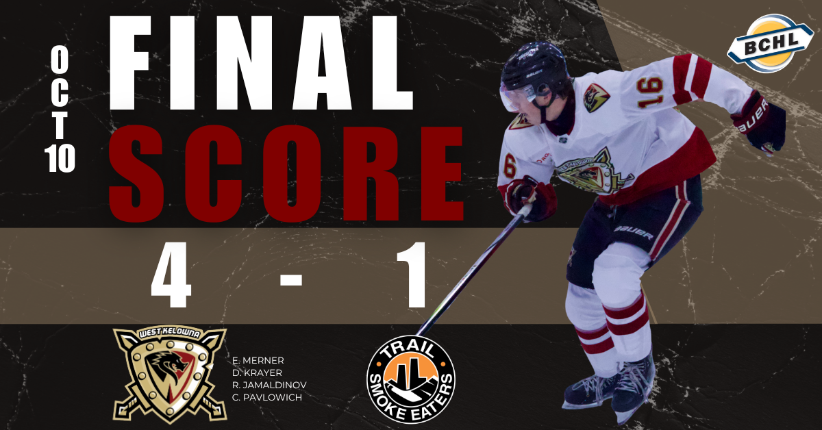 The West Kelowna Warriors handed the Trail Smoke Eaters their first loss of the season Friday night, earning a decisive 4–1 victory behind stellar goaltending from Angelo Zol and a dominant second-period surge.